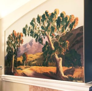 "The scenic mural that Katie Ann Hill painted on the large entry wall, was influenced by my favorite George Demont Otis painting. Blending her paints to either match, or harmonize, with the painting, plus scale, seemed magical to me. Hmm, now what other wall could use Katie Ann’s talent?"